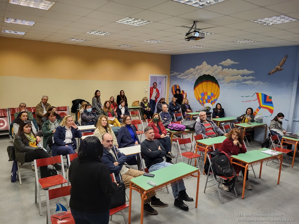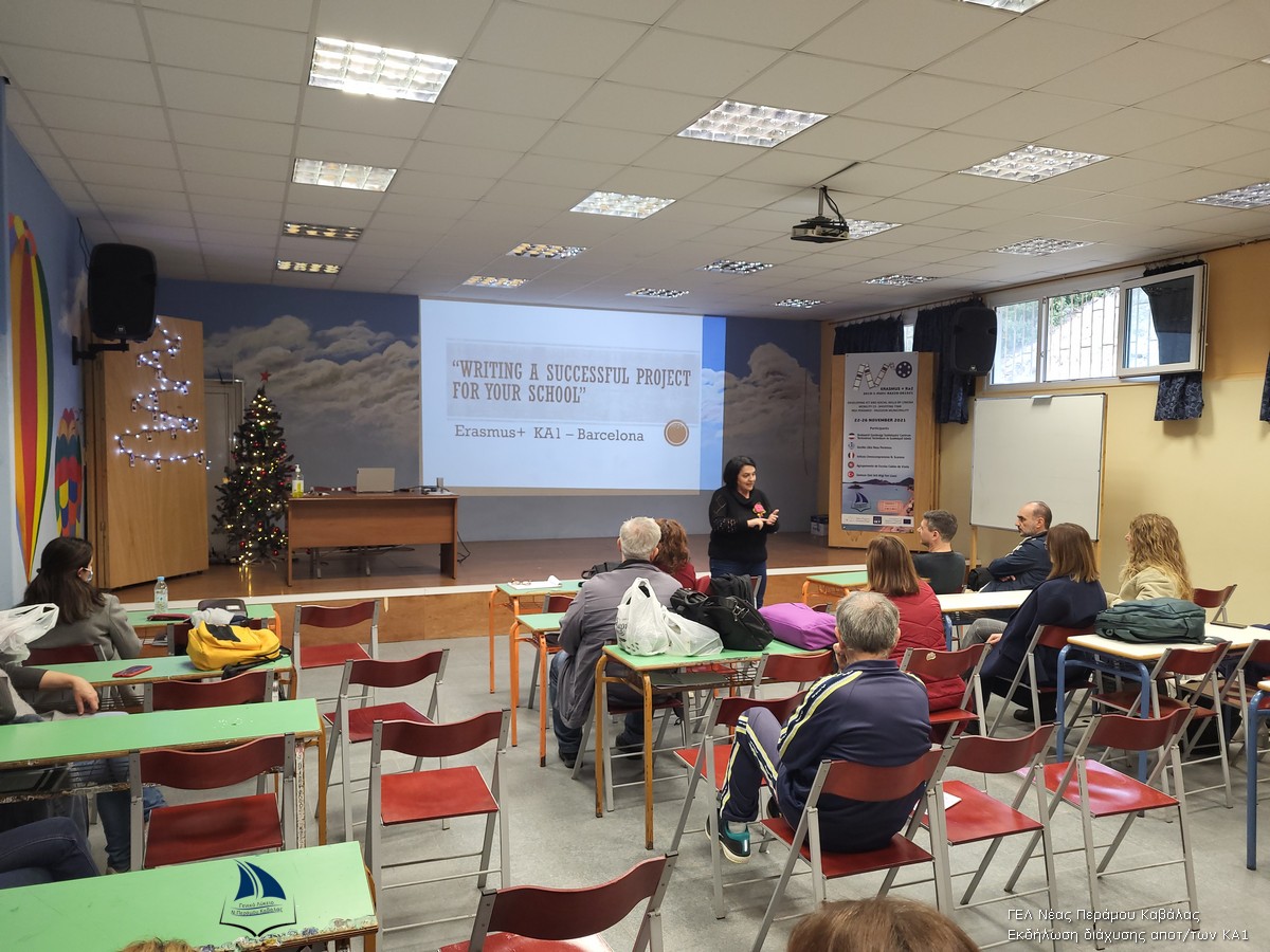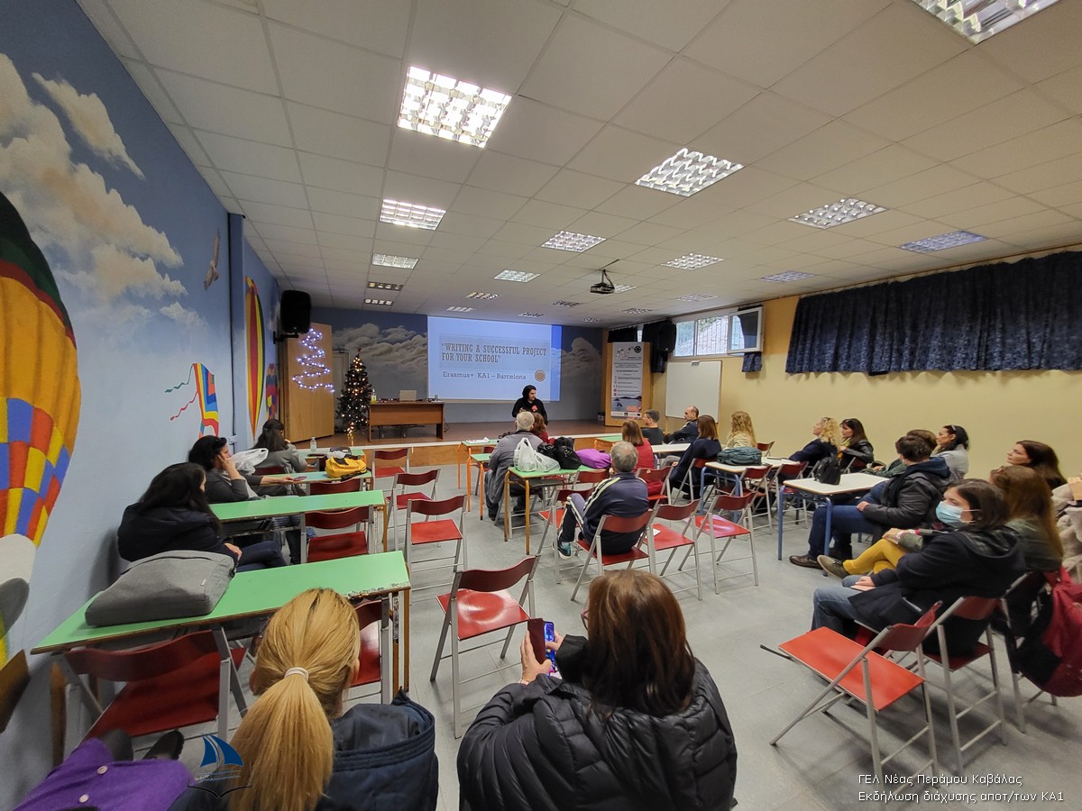 Την Πέμπτη 30 Νοεμβρίου στην αίθουσα πολλαπλών χρήσεων του σχολείου μας στα πλαίσια της διάχυσης των αποτελεσμάτων του παραπάνω προγράμματος πραγματοποιήθηκε μία εκδήλωση με θέμα «Πως γράφουμε μία επιτυχημένη πρόταση για ένα πρόγραμμα Erasmus;». Στην εκδήλωση συμμετείχαν οι εκπαιδευτικοί του σχολείου μας αλλά και εκπαιδευτικοί του όμορου Γυμνασίου Νέας Περάμου.