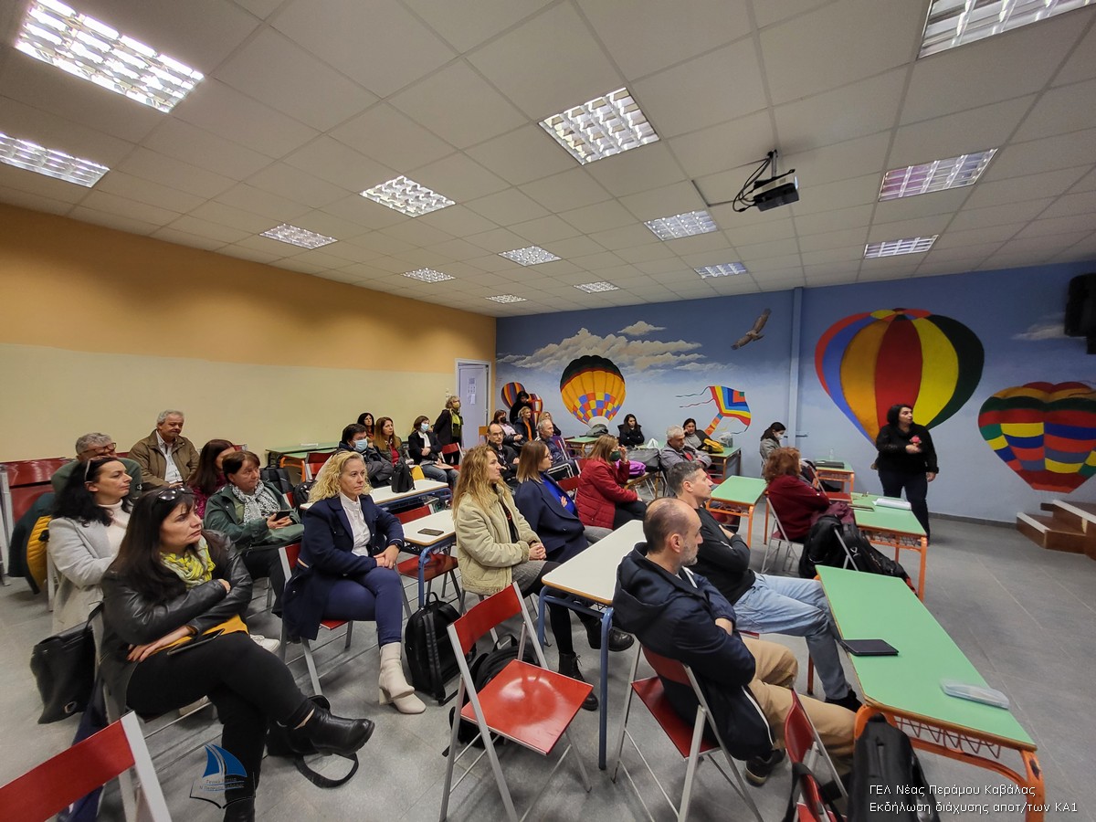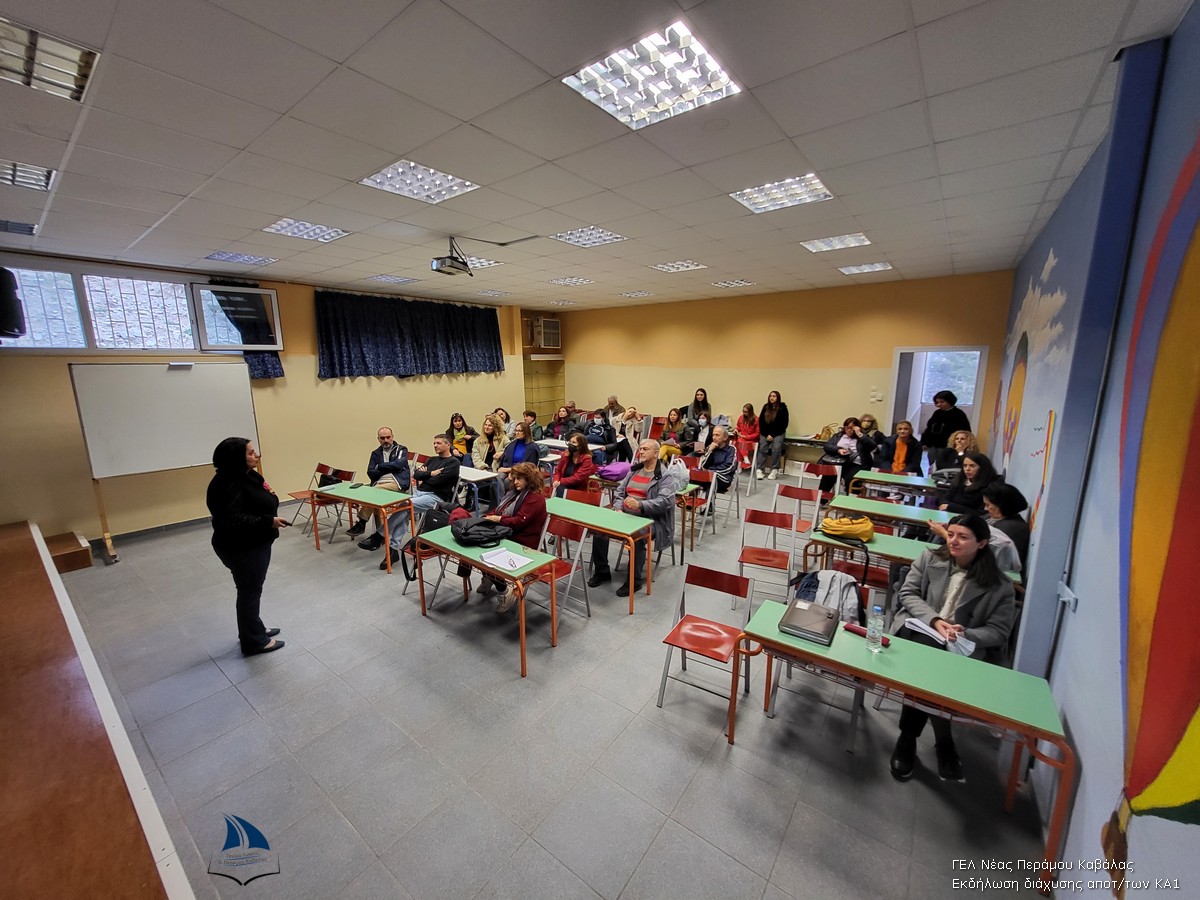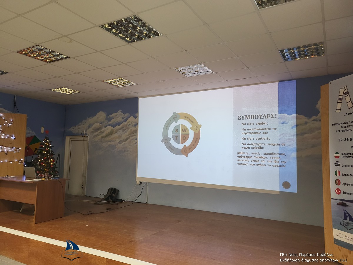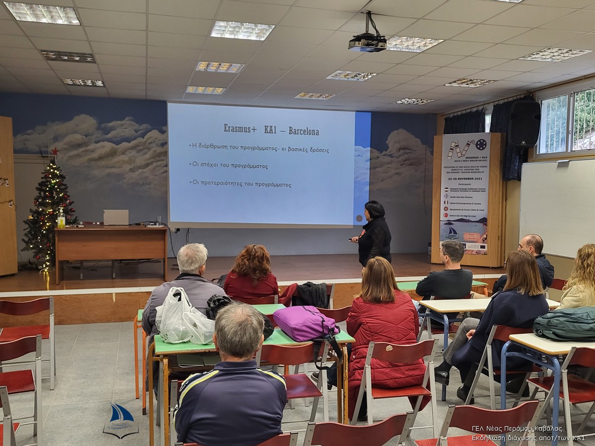 Την Πέμπτη 30 Νοεμβρίου στην αίθουσα πολλαπλών χρήσεων του σχολείου μας στα πλαίσια της διάχυσης των αποτελεσμάτων του παραπάνω προγράμματος πραγματοποιήθηκε μία εκδήλωση με θέμα «Πως γράφουμε μία επιτυχημένη πρόταση για ένα πρόγραμμα Erasmus;». Στην εκδήλωση συμμετείχαν οι εκπαιδευτικοί του σχολείου μας αλλά και εκπαιδευτικοί του όμορου Γυμνασίου Νέας Περάμου.