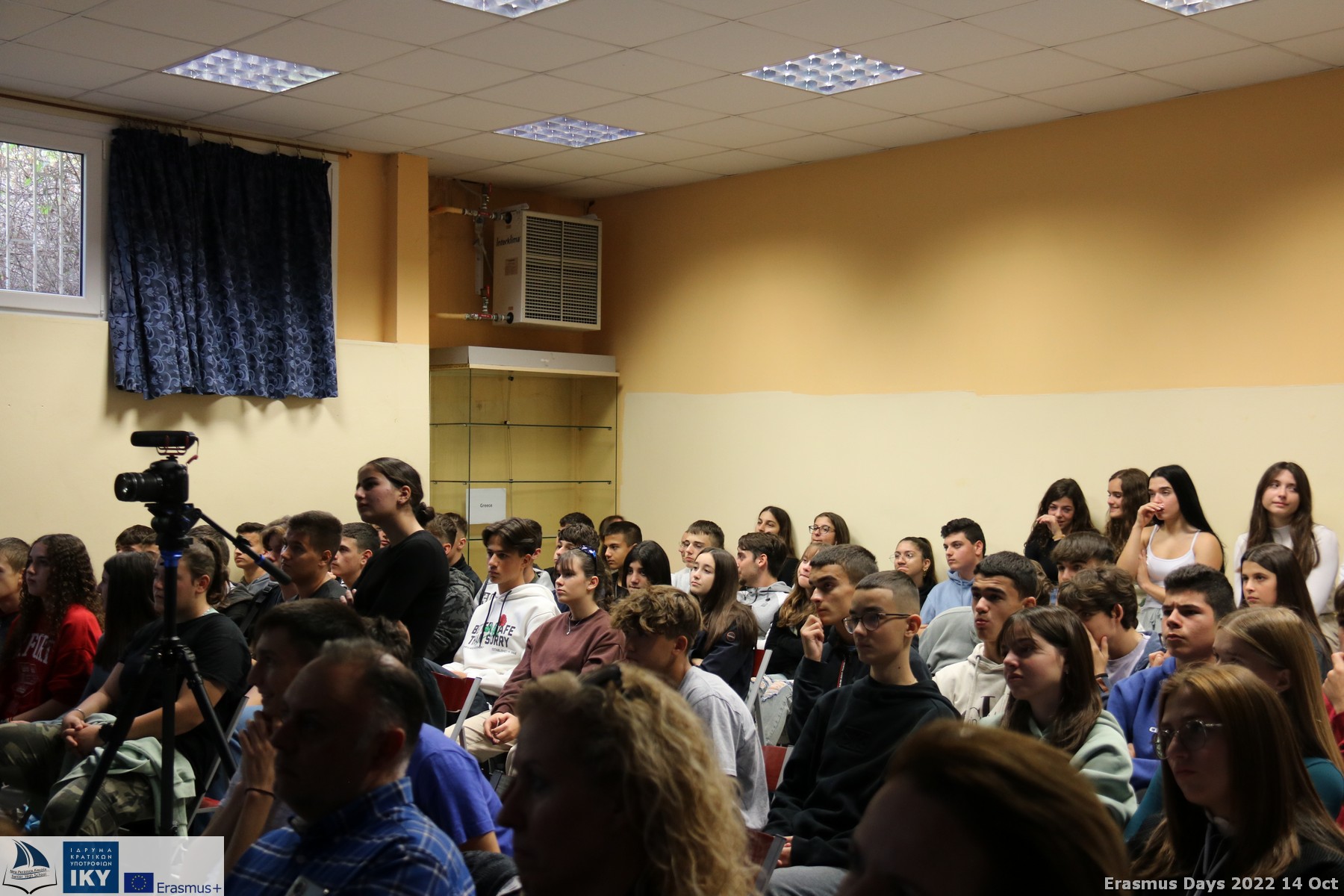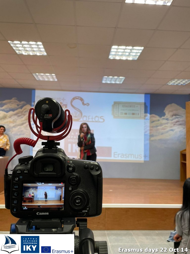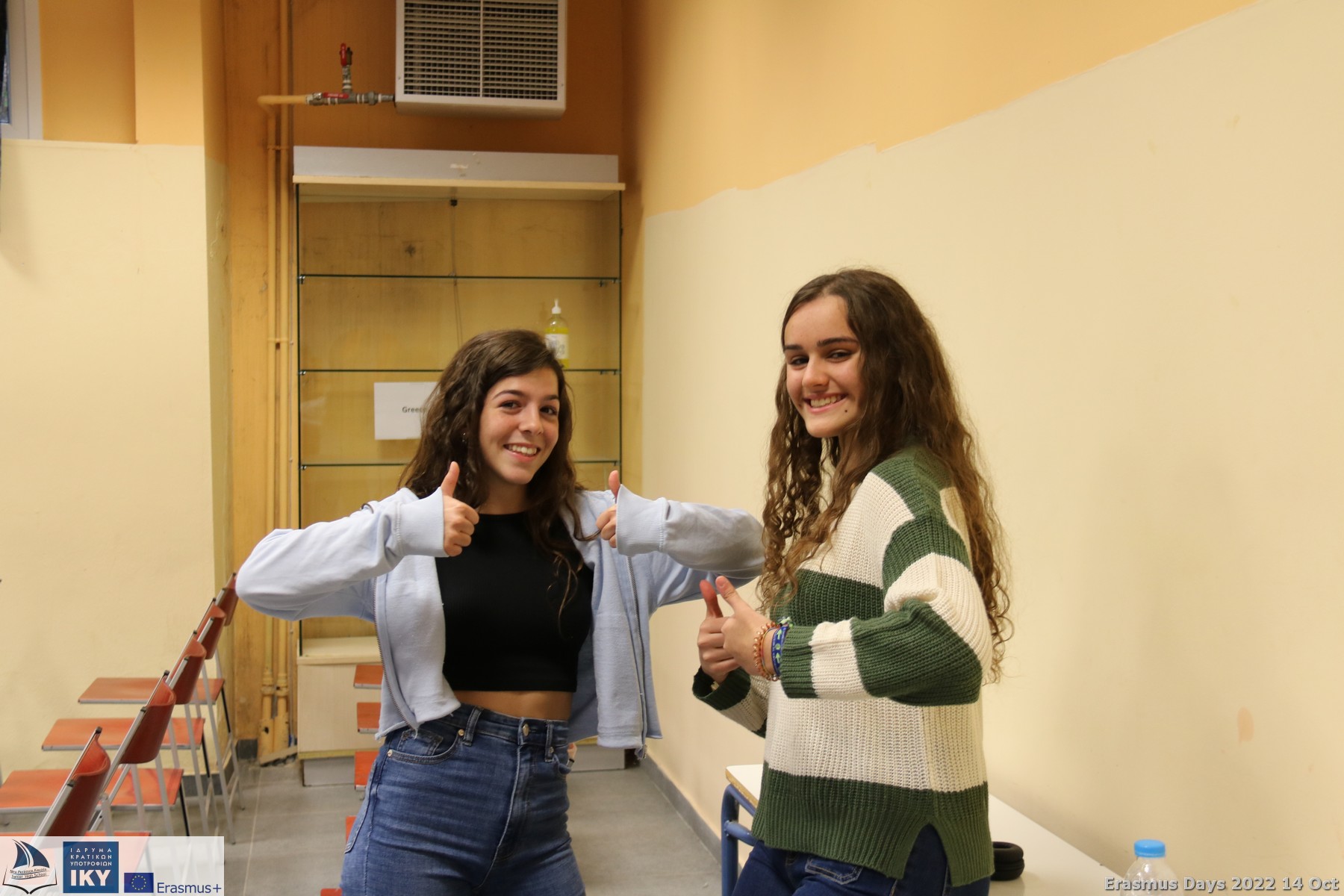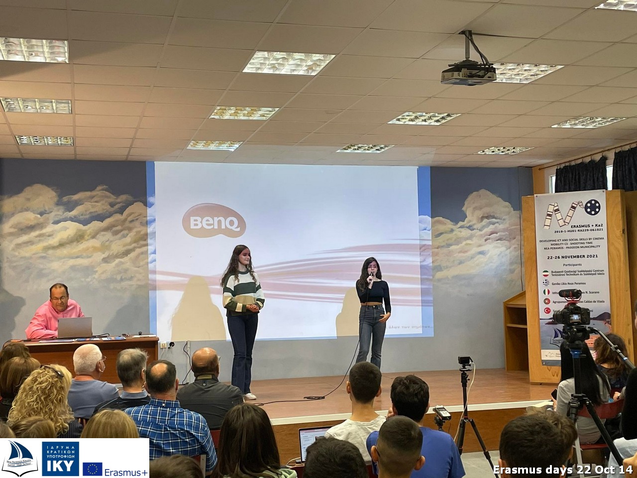 To bring back memories of last year's events, the video "Erasmus experience" which was created by Bosko Niko and Pantidi Gianni, was presented. The video which refers to all the positives this specific program has to offer to an active student. From the beginning of October until the beginning of November our high school will accommodate two students from the high school of Almagro, Maria Triguero Chacon and Helena Marillo Caminero, who courageously accepted to attend their lessons in Greek for a month, learn about our culture and live just like the teenagers here. In the event, the two students spoke up and shared with us their first impressions of the hospitality they received in our school.