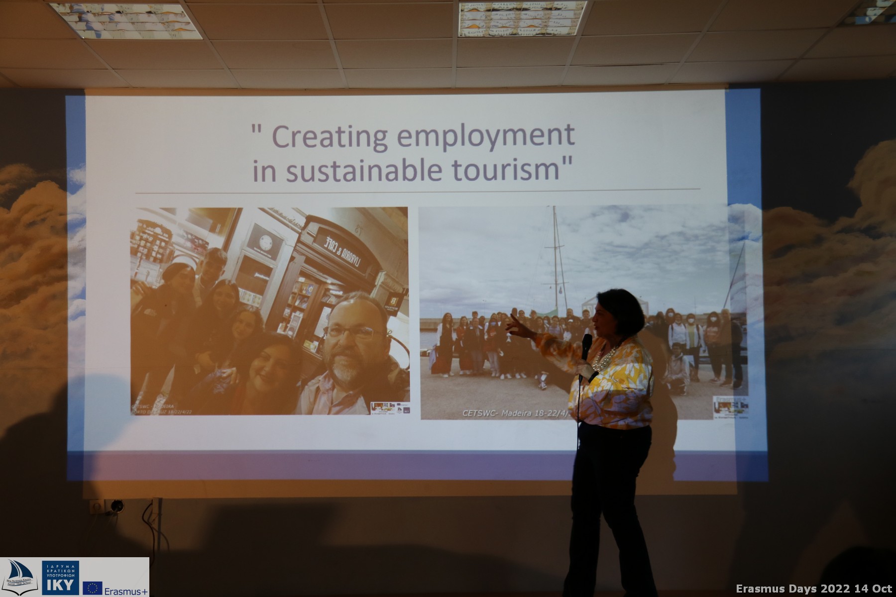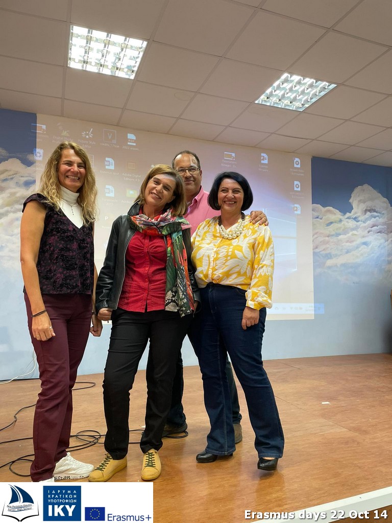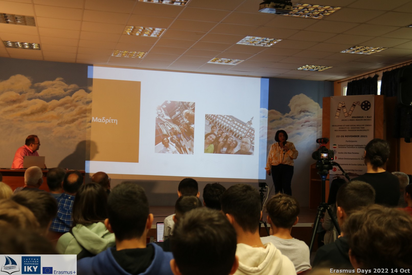 On the 14th of October 2022 our long-lasting adventure was presented in the event hall to the teachers of our school, but also to the teachers of our neighboring junior high school, as well as to the students of the first class of high school. The presentation started with a short overview of the last movement of Erasmus with the topic being "Creating employment in sustainable tourism" which was held in July of 2022 in the picturesque city of Don Quixote, Almagro, and in other places in Spain, such as Toledo and Madrid. The participants were the teachers Pigadas Vasilis, Giagmouridou Evdokia, and the students Ioannidou Christina, Strantza Faedra, Kotsi Arbiona, Eva Semaltianou, Kourtidou Efi and Kourtidis Giannis.
