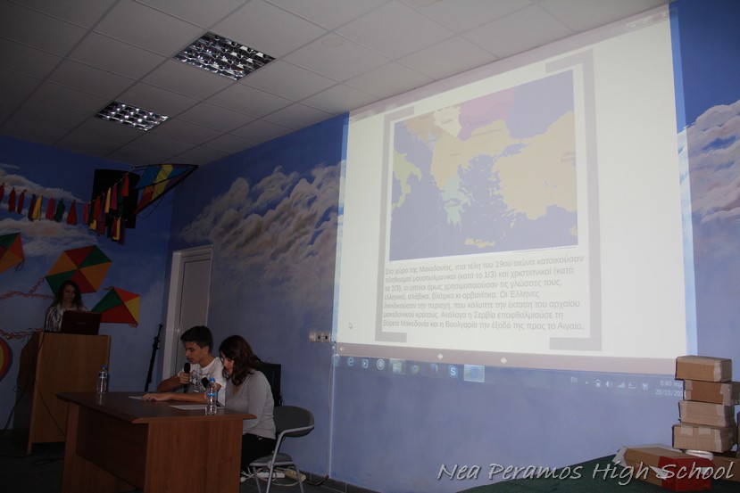 Σήμερα, 20 Οκτωβρίου, ημέρα μνήμης του Μακεδονικού Αγώνα, πραγματοποιήθηκε στο σχολείο μας ομιλία με θέμα το Μακεδονικό Ζήτημα. Η ομιλία, που εκφωνήθηκε από τους μαθητές της Γ΄ Λυκείου Κυριάκο Οφλίδη και Αγγελική Χαραλαμπίδου, είχε στόχο την ενημέρωση των μαθητών για τα γεγονότα που συνέβησαν στο Μακεδονικό χώρο κατά το 19ο και 20ο αιώνα, από την έναρξη της επανάστασης μέχρι τη δημιουργία του κράτους "Πρώην Γιουγκοσλαβική Δημοκρατία της Μακεδονίας". Κατά την ενημέρωση αυτή, έγιναν αναφορές και στην τοπική ιστορία, σε γεγονότα που έλαβαν χώρα στην περιοχή του δήμου Παγγαίου και την Καβάλα. Την συνολική παρουσίαση του αφιερώματος στο Μακεδονικό Αγώνα, την οποία δημιούργησε η κ. Φελλαχίδου, μπορείτε να την προβάλλετε στον παρακάτω σύνδεσμο.