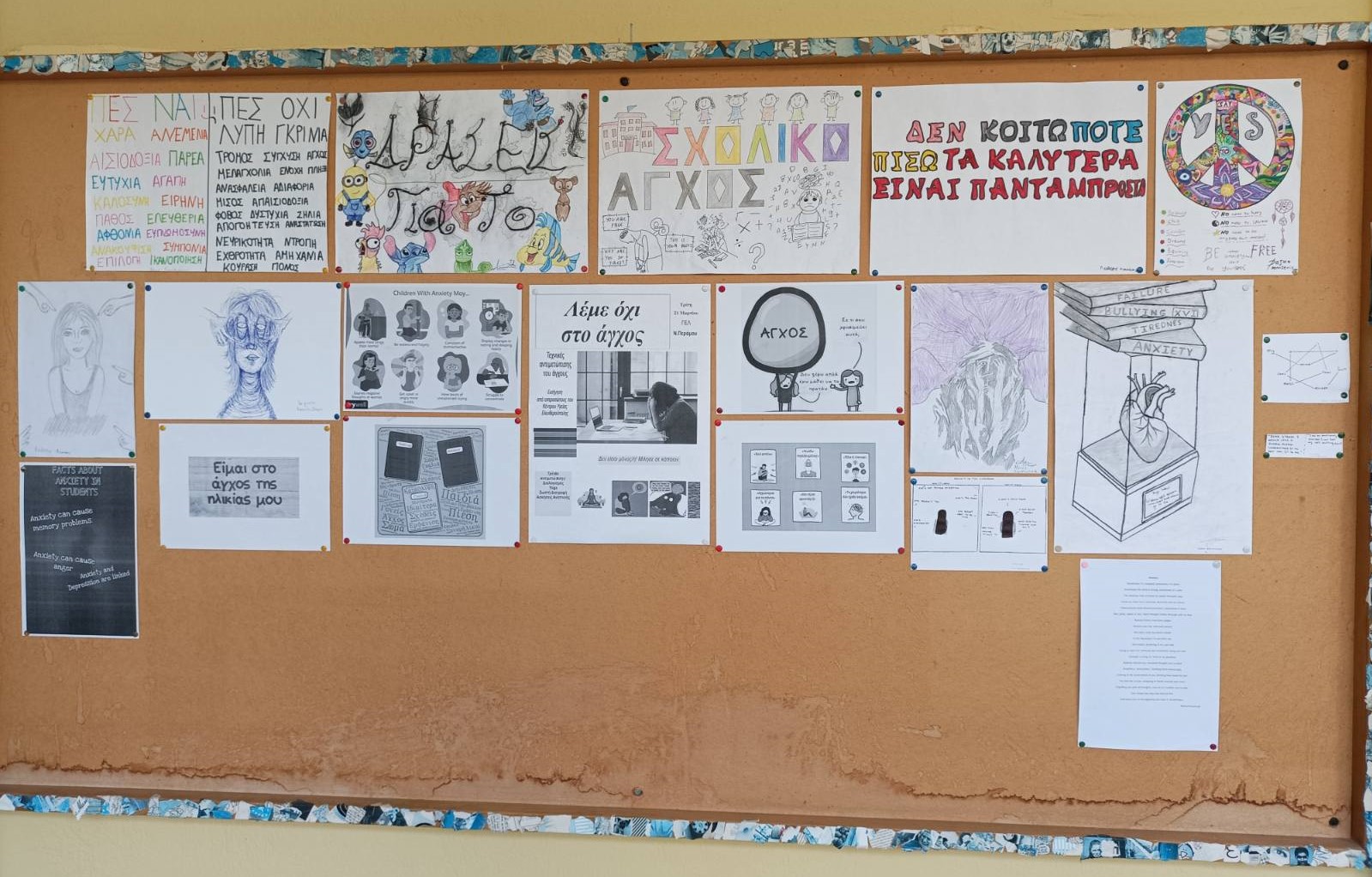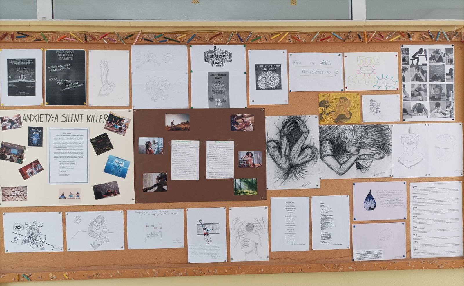 During the period from October to May, the students expressed themselves in various ways on the topic of school anxiety, either individually or in groups. They recorded short sketches using their own electronic devices (mobile phones and cameras), they designed posters with slogans about anxiety, conducted interviews with psychologists for kids, created collages, painted, wrote poems in Greek and English, organised audiovisual material and gave presentations among other activities.