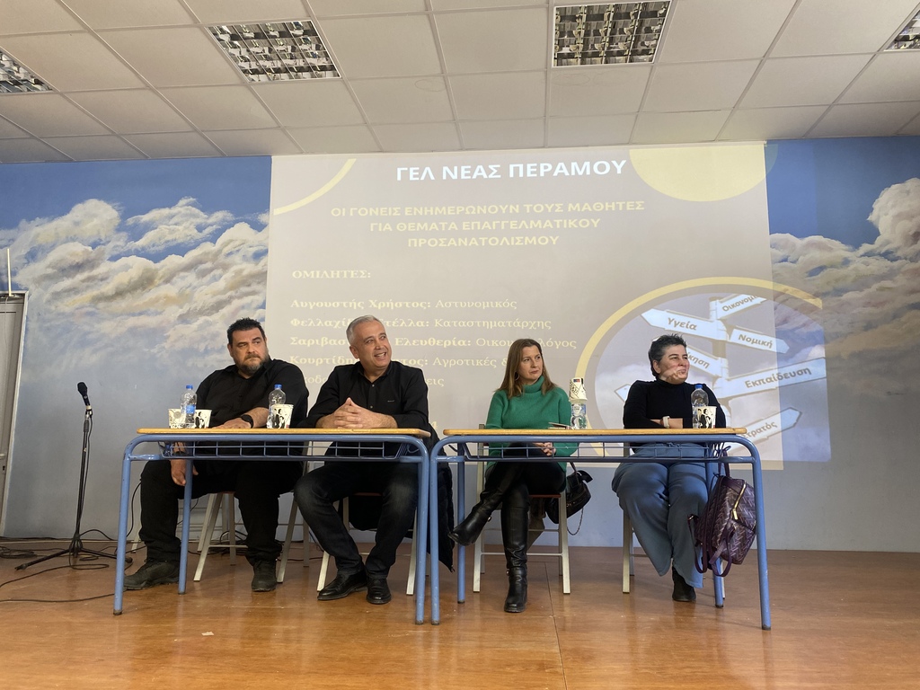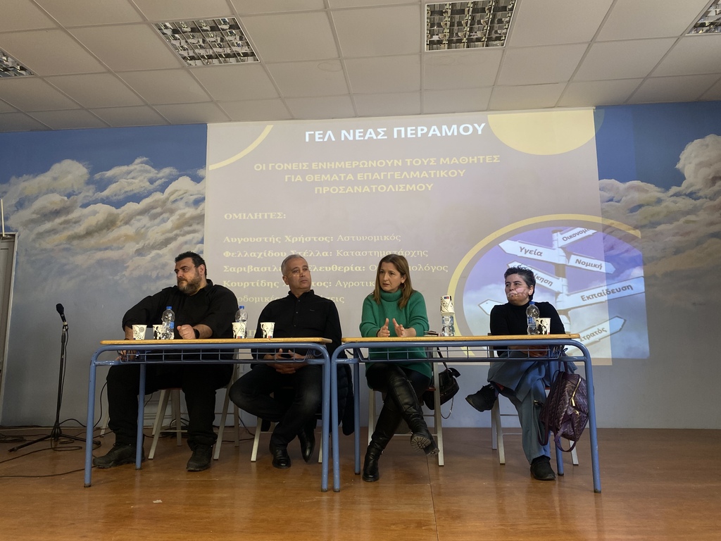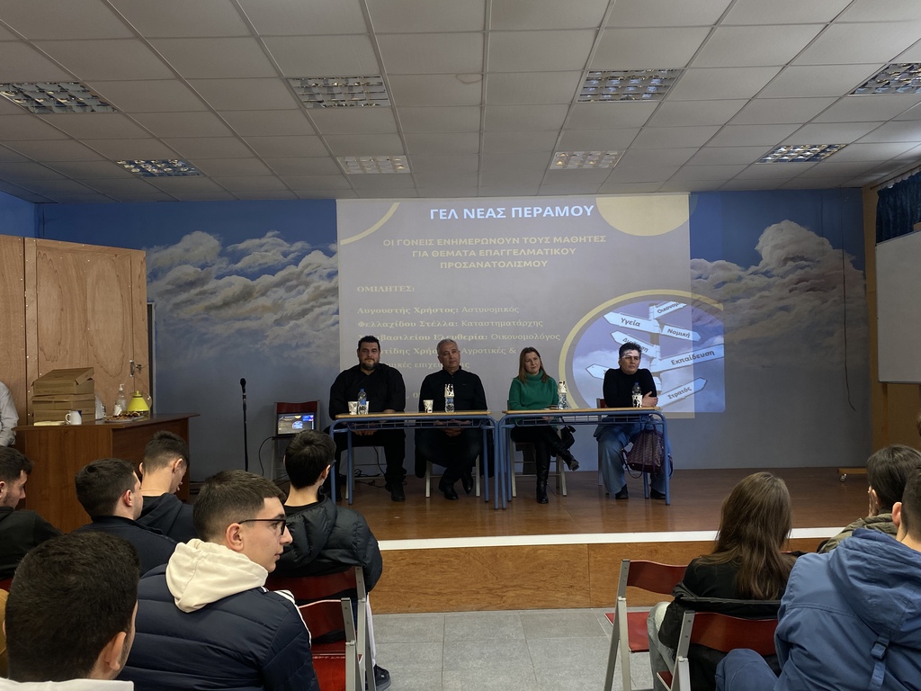 Έτσι, την Πέμπτη 8 Φεβρουαρίου, οι μαθητές της Β’ και Γ’ Λυκείου συγκεντρώθηκαν στην αίθουσα πολλαπλών χρήσεων του σχολείου, για να ενημερωθούν για ζητήματα επαγγελματικού προσανατολισμού από τους γονείς τους ή τους γονείς συμμαθητών τους. Πιο συγκεκριμένα, ο κύριος Αυγουστής Χρήστος, αστυνομικός, ο κύριος Κουρτίδης Χρήστος, που ασχολείται με αγροτικές και οικοδομικές επιχειρήσεις, η κυρία Σαριβασιλείου Ελευθερία, οικονομολόγος και η κυρία Φελλαχίδου Στέλλα, ιδιοκτήτρια επιχείρησης στον χώρο της αρτοποιίας και ζαχαροπλαστικής, αποδεχόμενοι την πρόσκλησή μας, μοιράστηκαν με τους μαθητές εμπειρίες από την επαγγελματική τους ζωή και τους έδωσαν πολύτιμες συμβουλές. Οι μαθητές συμμετείχαν ενεργά στην εκδήλωση, αφού διατύπωσαν πλήθος ερωτήσεων στους ομιλητές, οι οποίοι με χαρά και προθυμία ανταποκρίθηκαν στις απορίες τους.