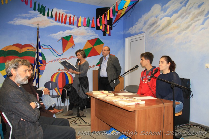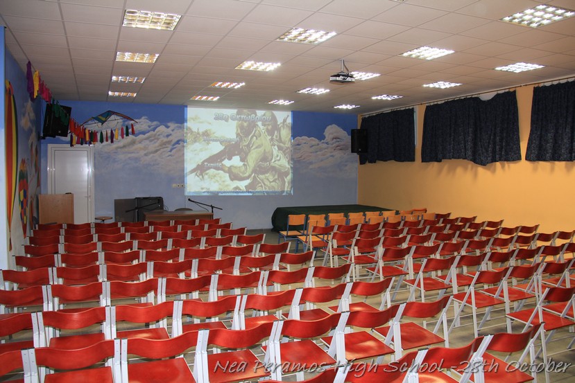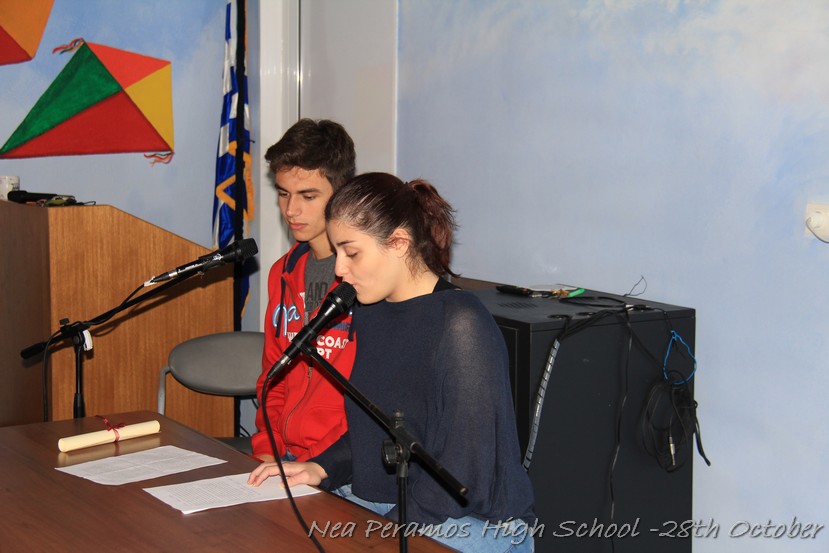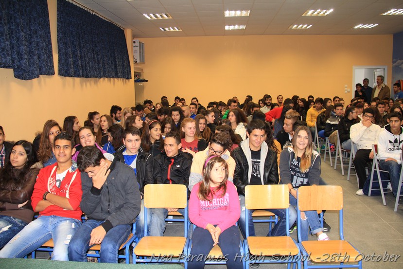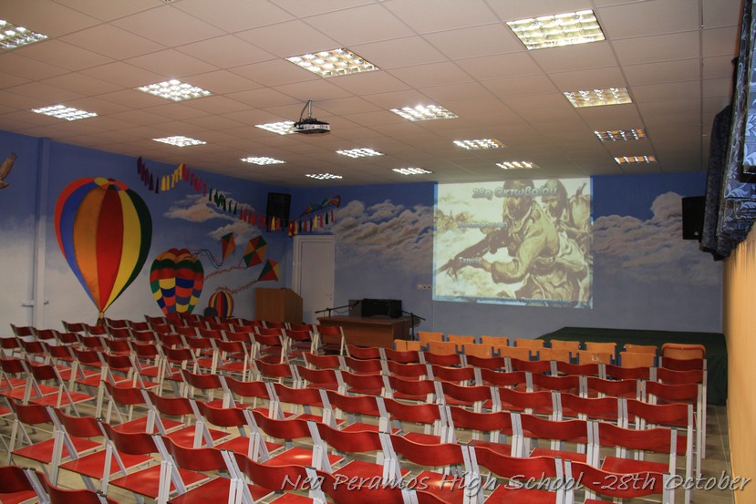 Ακολούθησε η προβολή κάποιων αποσπασμάτων από ντοκυμαντέρ και ταινίες που αφορούσαν την άνοδο του Χίτλερ στην εξουσία, την πολιτική που άσκησε αναφορικά με τους Εβραίους, την υπερπροσπάθεια των Ελλήνων στρατιωτών στο ελληνοαλβανικό μέτωπο και , τέλος, τη δύσκολη περίοδο της κατοχής για τους Έλληνες. Τα αποσπάσματα των ταινιών προλόγισαν οι μαθητές της Γ ? Λυκείου Οφλίδης Κυριάκος και Χαραλαμπίδου Αγγελική.