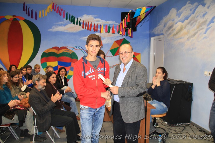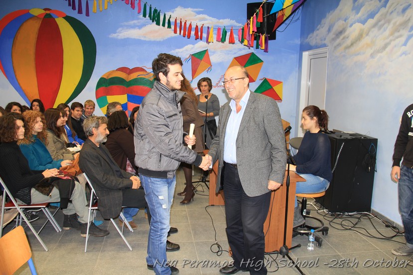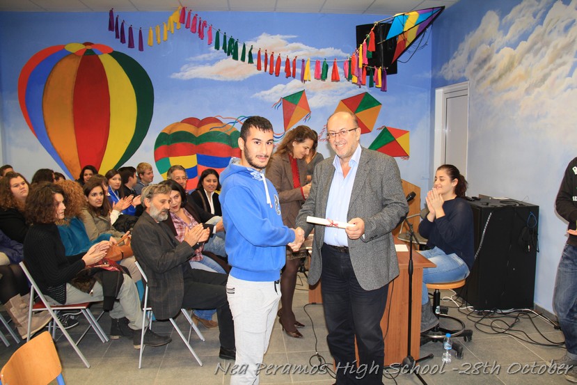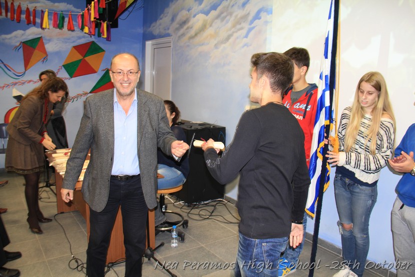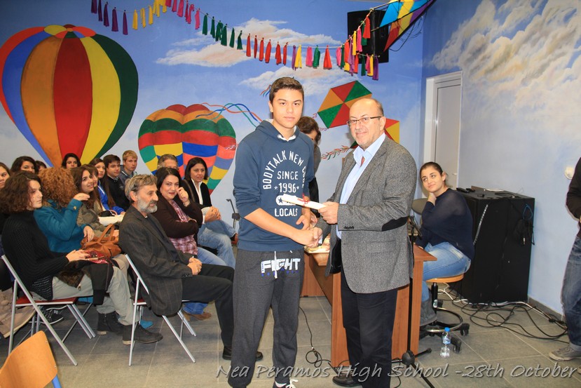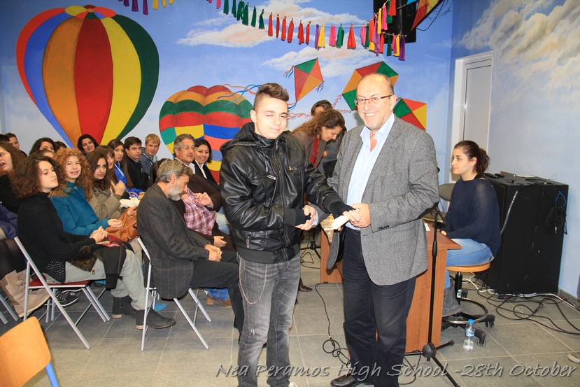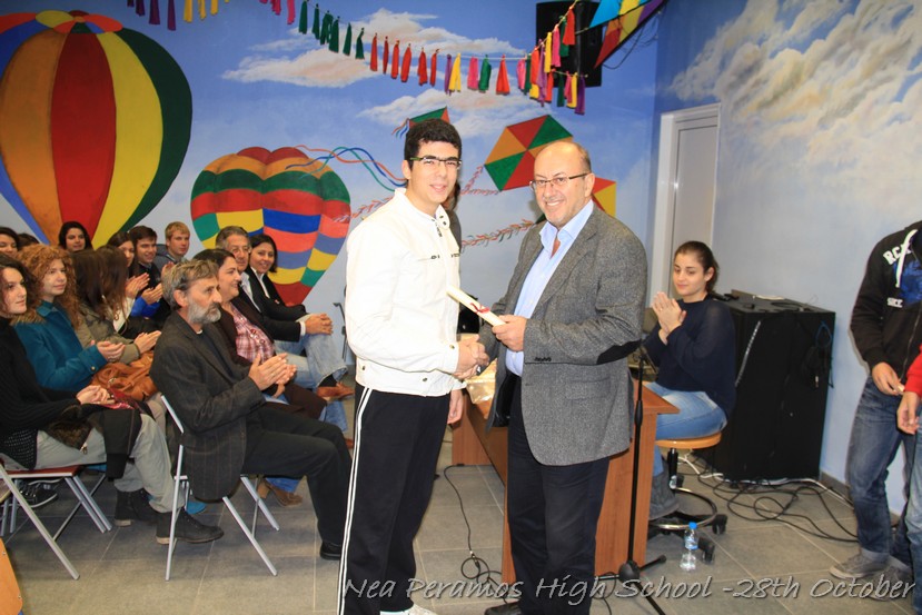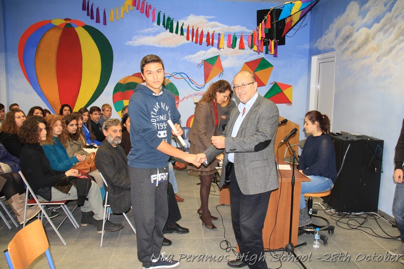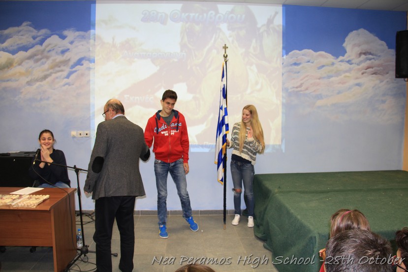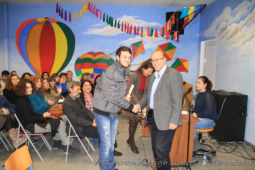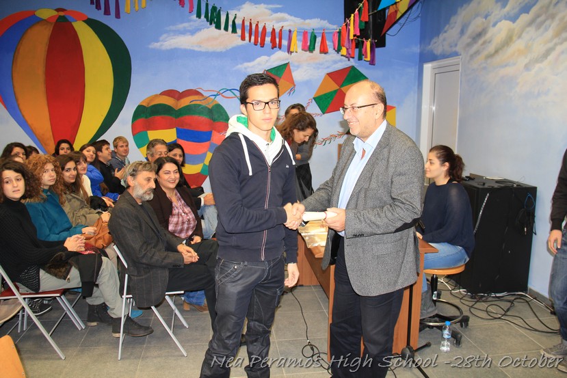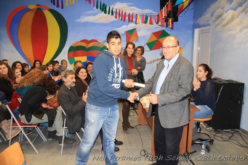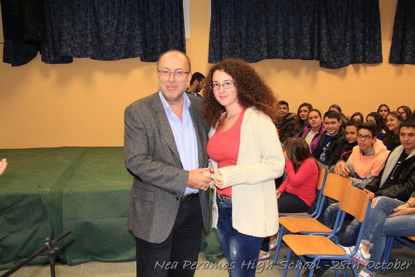 Τη Δευτέρα 27 Οκτωβρίου 2014, στην αίθουσα πολλαπλών εκδηλώσεων του Γενικού Λυκείου Νέας Περάμου, πραγματοποιήθηκε ο καθιερωμένος εορτασμός της 28ης Οκτωβρίου του ?40. Στα πλαίσια της εκδήλωσης έγινε και η απονομή βραβείων και αριστείων στους αριστούχους μαθητές του σχολείου από το Διευθυντή κ. Χ. Αυγερινάκη.