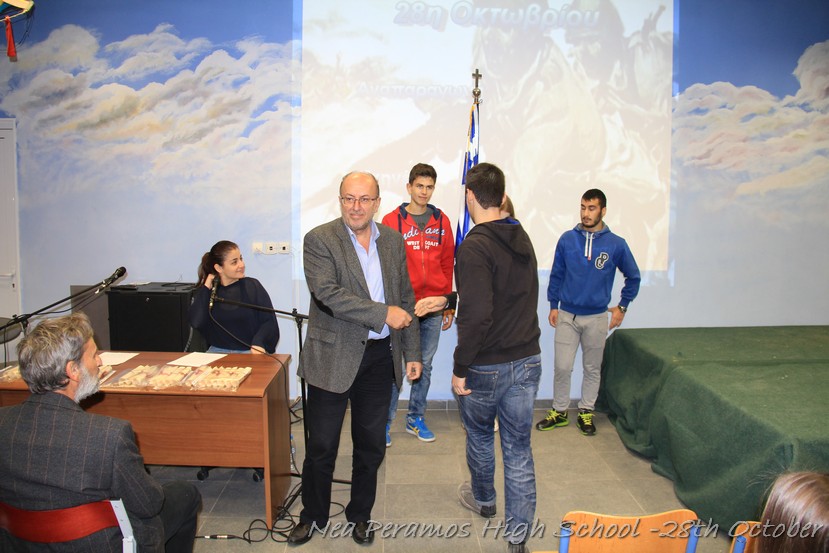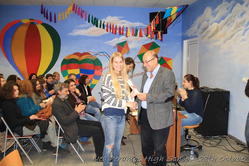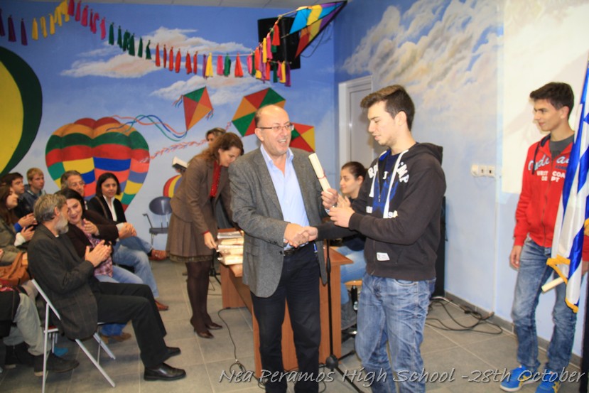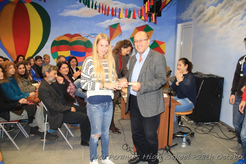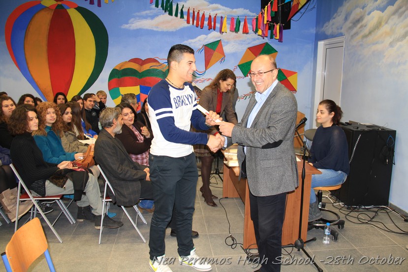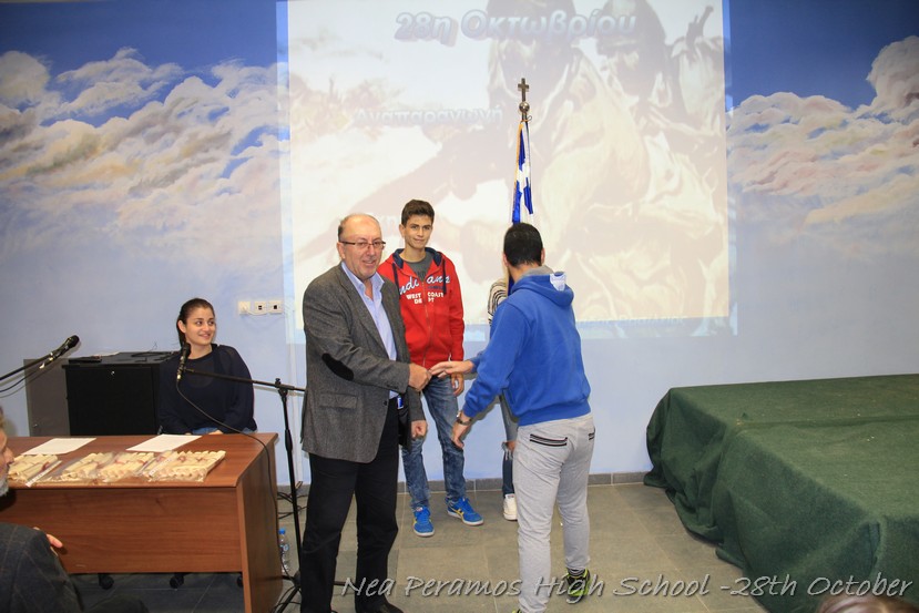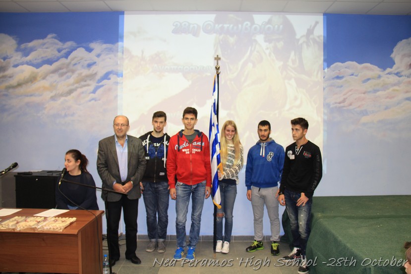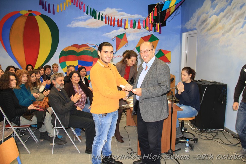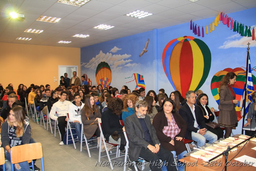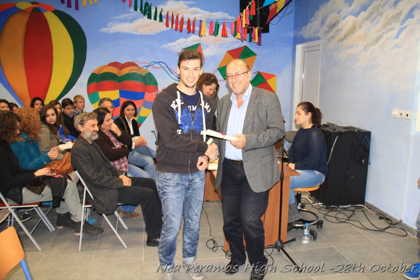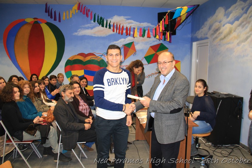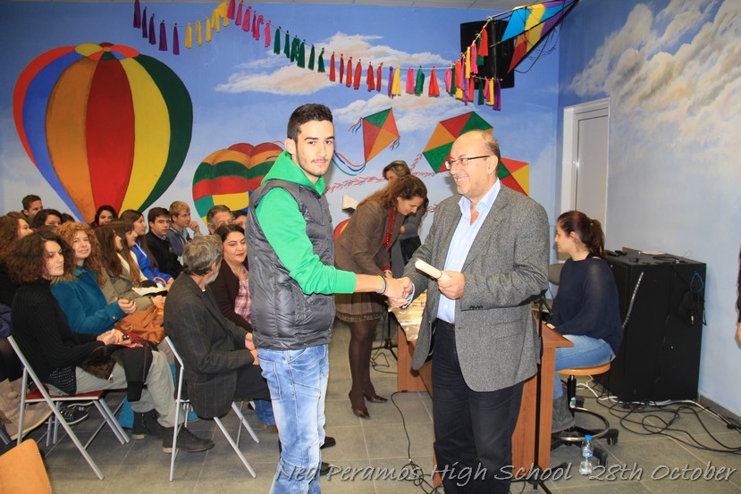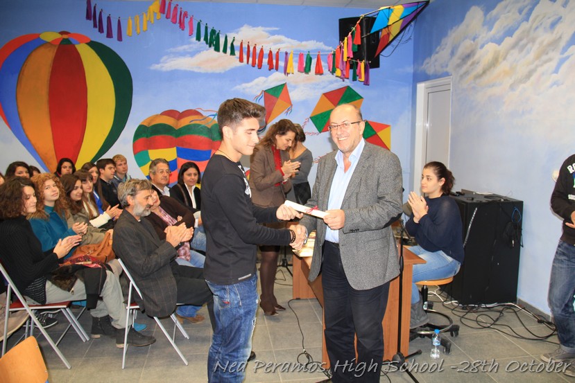 Τη Δευτέρα 27 Οκτωβρίου 2014, στην αίθουσα πολλαπλών εκδηλώσεων του Γενικού Λυκείου Νέας Περάμου, πραγματοποιήθηκε ο καθιερωμένος εορτασμός της 28ης Οκτωβρίου του ?40. Στα πλαίσια της εκδήλωσης έγινε και η απονομή βραβείων και αριστείων στους αριστούχους μαθητές του σχολείου από το Διευθυντή κ. Χ. Αυγερινάκη.