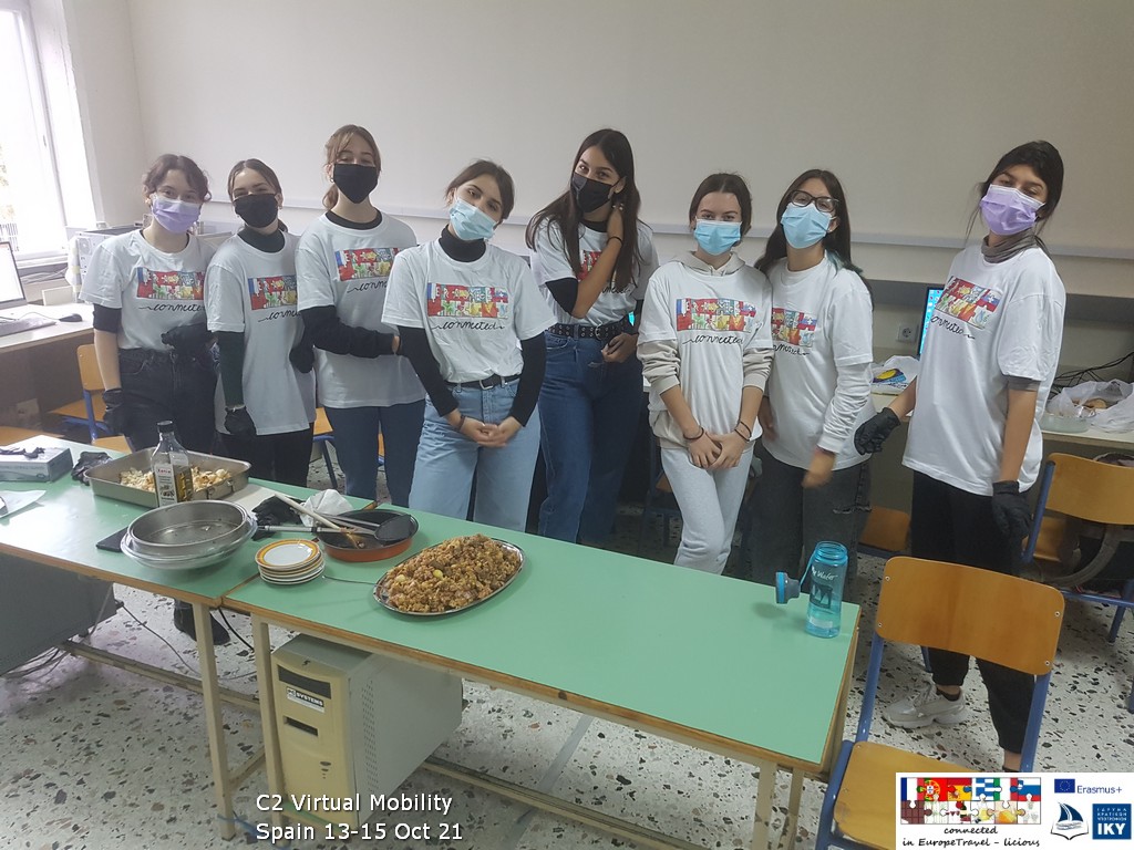 Την τελευταία ημέρα της κινητικότητας, στις 15 Οκτωβρίου, οι ομάδες όλων των σχολείων παρουσίασαν παραδοσιακά φαγητά της χώρας τους, που θα μπορούσαν να συνοδευτούν με το κρασί, και στη συνέχεια ετοίμασαν ένα παραδοσιακό φαγητό της Ισπανίας, το Migas, για τη δημιουργία του οποίου χρειάστηκε ψωμί, αυγά και λουκάνικα. Το ψήσιμο του φαγητού έκλεισε πανηγυρικά την εικονική μας συνάντηση… Μετά το κρασί, τι; Να είστε σε αναμονή για το τι θα ακολουθήσει…