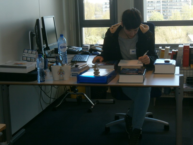 Την Παρασκευή 17-4-15 το πρόγραμμα περιλάμβανε επίσκεψη των αντιπροσωπιών στη Γενική Διεύθυνση Μετάφρασης. Εκεί η κ. Αράπογλου συμμετείχε σε συνεδρίαση των καθηγητών και της ομάδας των Ευρωπαίων μεταφραστών, ενώ ο Θανάσης ξεναγήθηκε στα γραφεία των μεταφραστών, όπου η Ελληνίδα μεταφράστρια της Ευρωπαϊκής Επιτροπής κ. Πολίτου Αφροδίτη έδειξε στο Θανάση τον τρόπο εργασίας και τα εργαλεία των μεταφραστών και δούλεψε μαζί του πάνω στη μετάφραση ενός κειμένου.