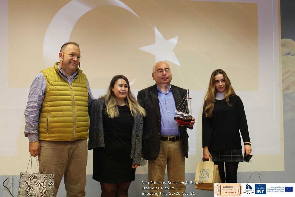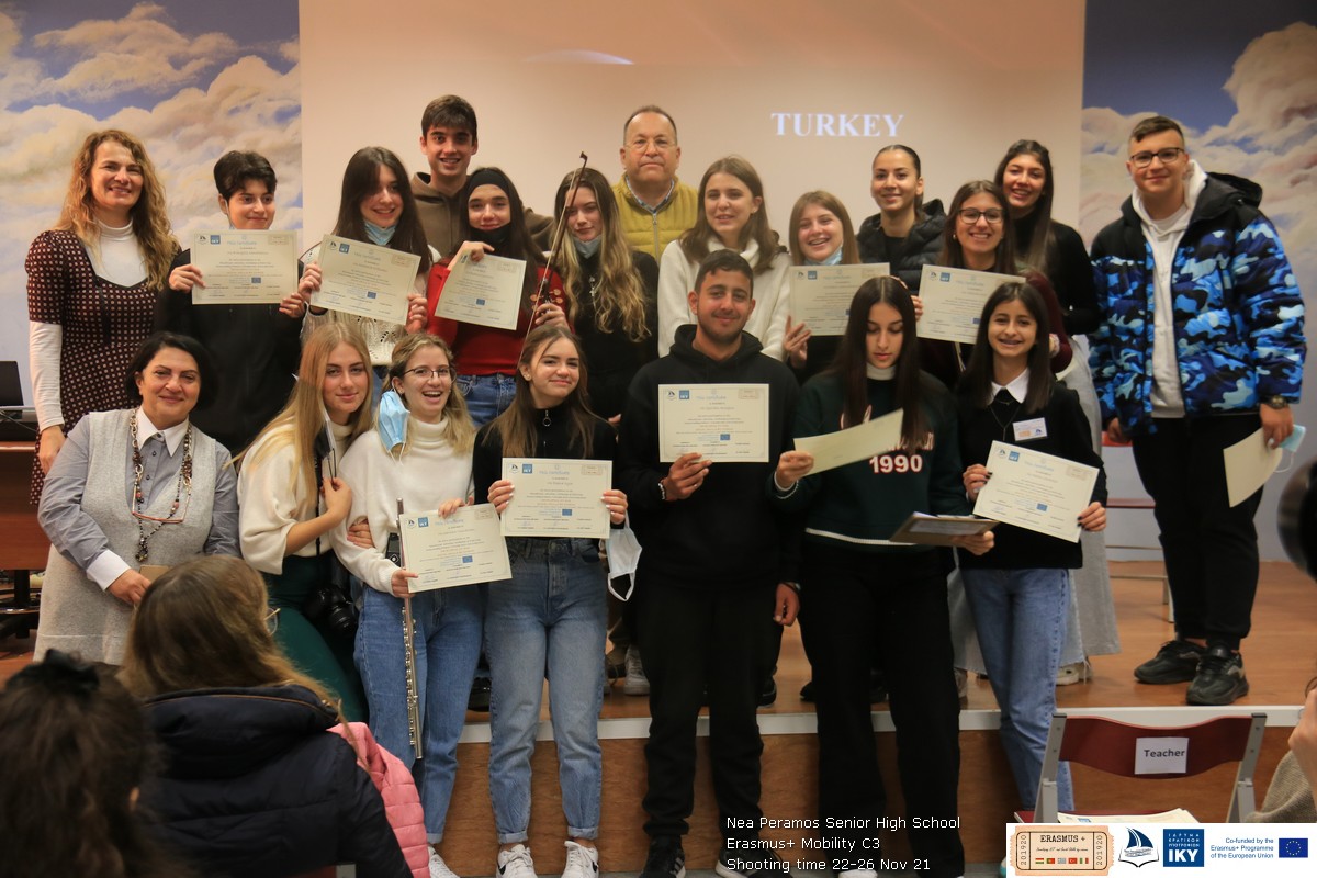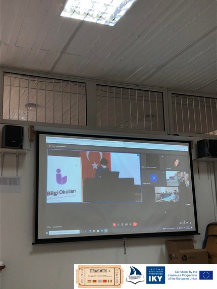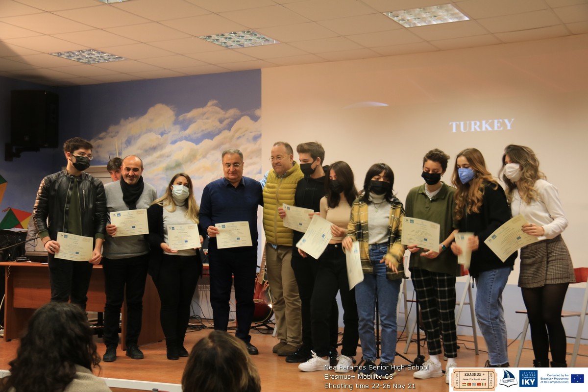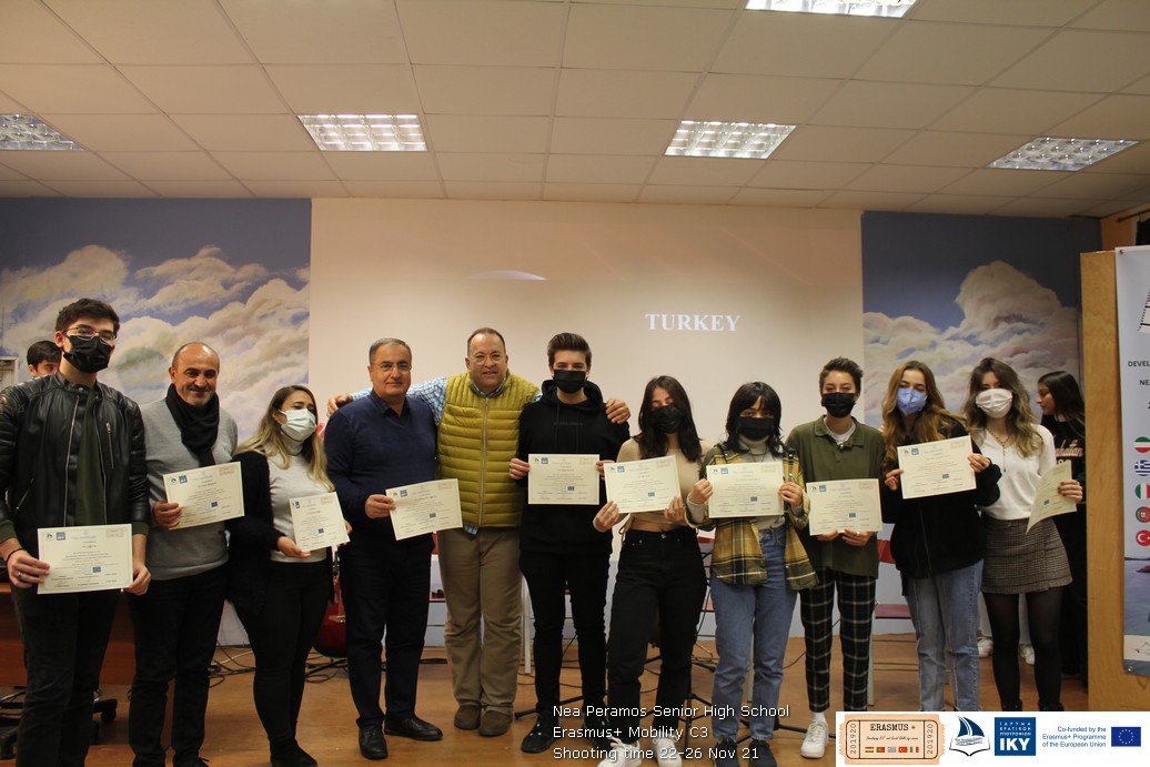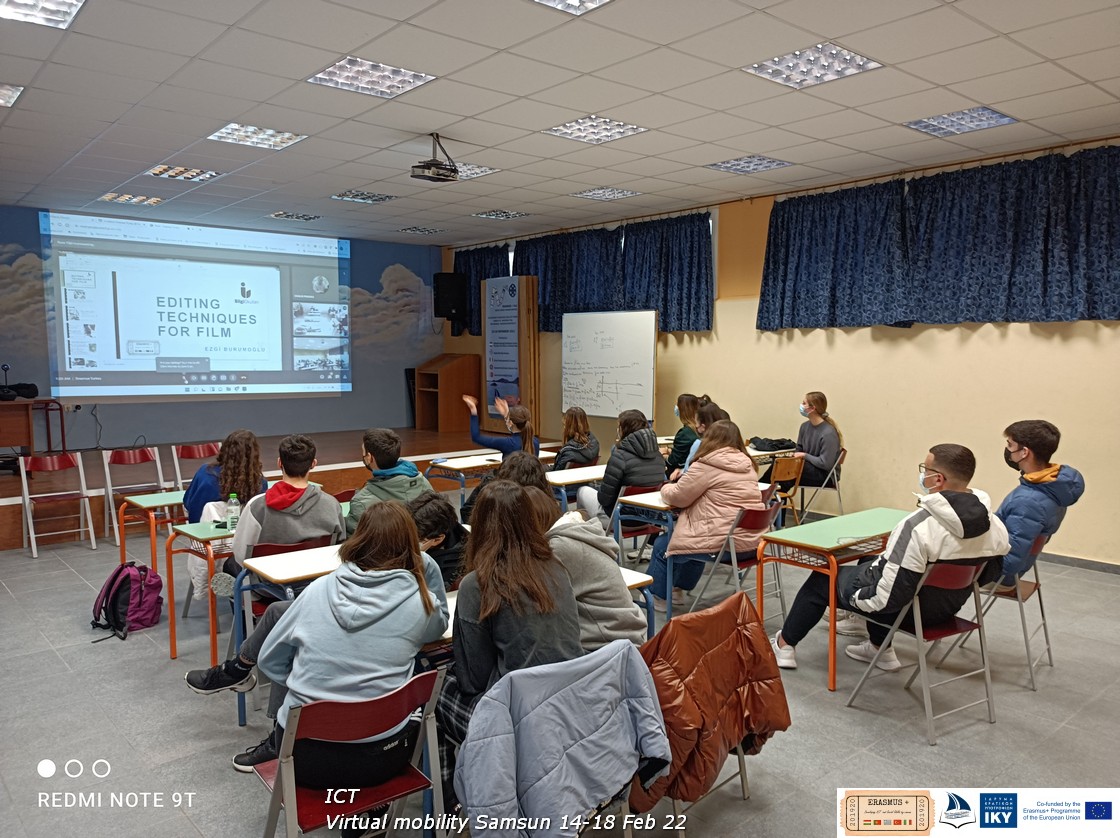 Έτσι, οι μαθητές και καθηγητές του προγράμματος Erasmus, που αφορά στην εξέλιξη του κινηματογράφου ως μέσου καλλιέργειας κοινωνικών δεξιοτήτων, «Developing ICT and social skills by cinema», συμμετείχαν σε δραστηριότητες που διεξήχθησαν στην Τουρκία από το εργαστήριο πληροφορικής του λυκείου μας. Αρχικά συνομίλησαν με τους συμμαθητές τους, καλλιέργησαν φιλικές σχέσεις και έπαιξαν διαδικτυακά παιχνίδια γνώσης και μνήμης με το Kahoot. Στη συνέχεια, παρακολούθησαν το σεμινάριο «Ήχος και φως» («Light and sound»), την επιμόρφωση επεξεργασίας ταινίας-μοντάζ («Εditing presentation») και ακολούθως, μετά τη θεωρία, προχώρησαν ανά ομάδες σε εργαστήρια επεξεργασίας βίντεο. Έτσι δημιούργησαν τις δικές τους μικρές ταινίες από το υλικό που είχαν στη διάθεσή τους, φωτογραφίες και βίντεο, κατά την επίσκεψη των ευρωπαϊκών σχολείων στην Ν.Πέραμο τον Νοέμβριο του 2021.