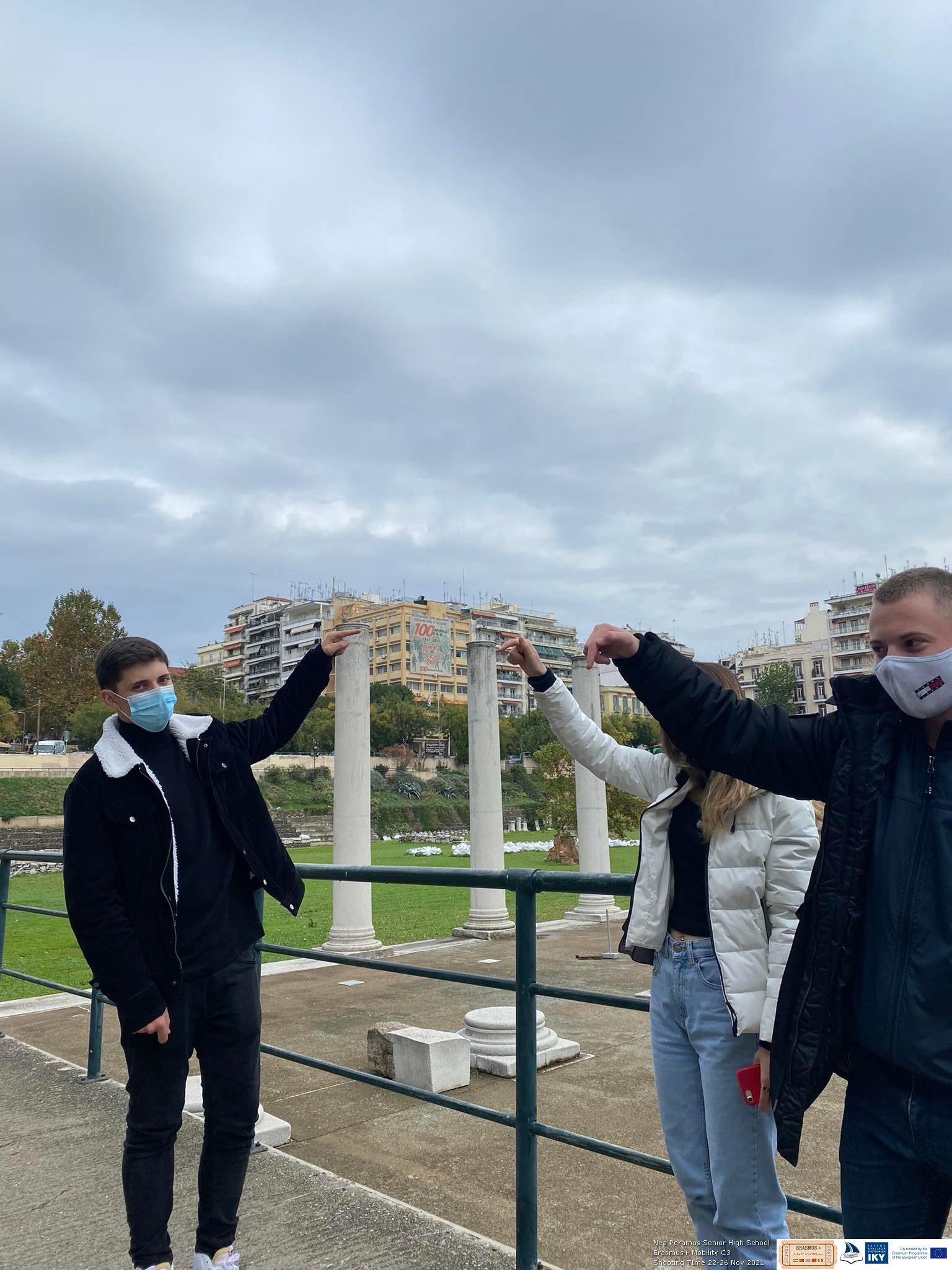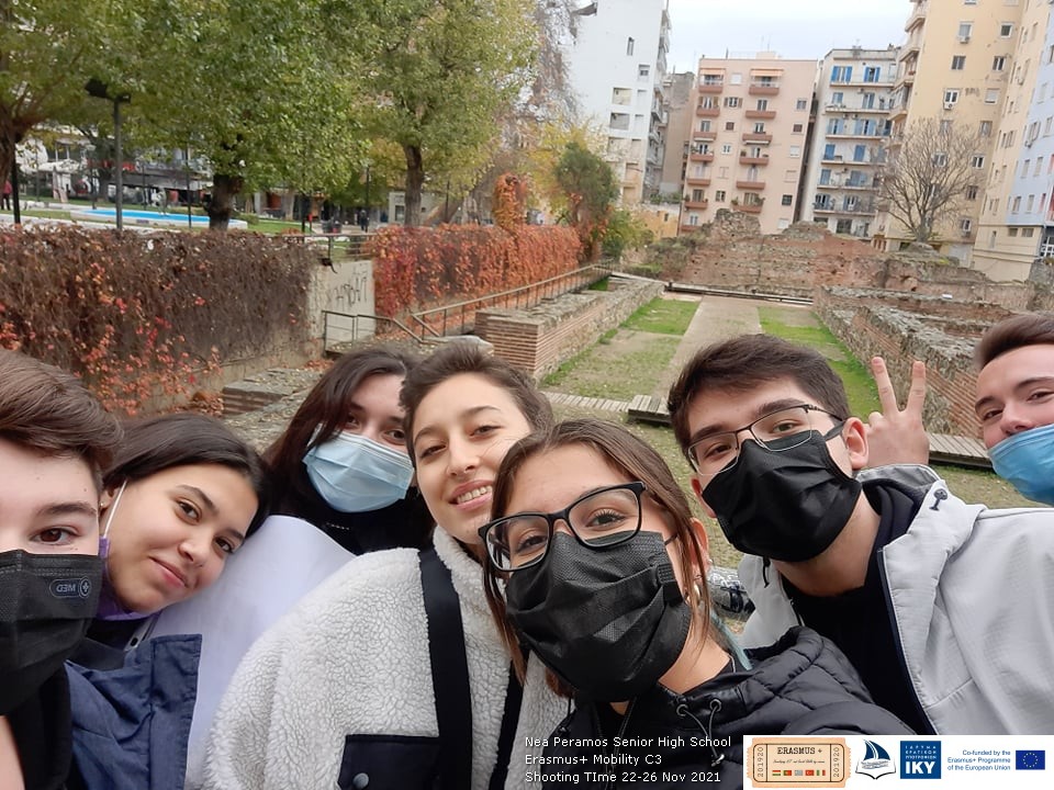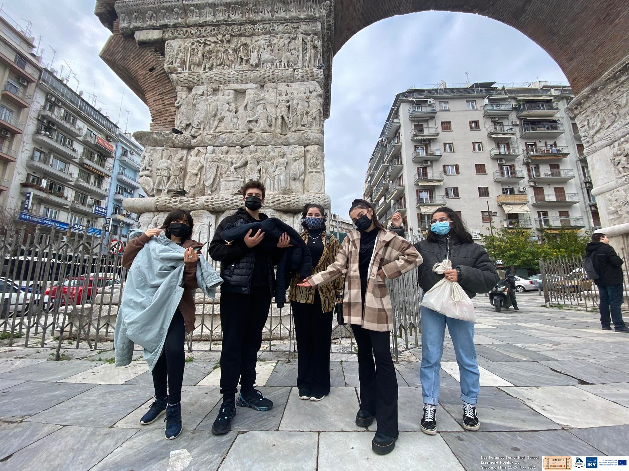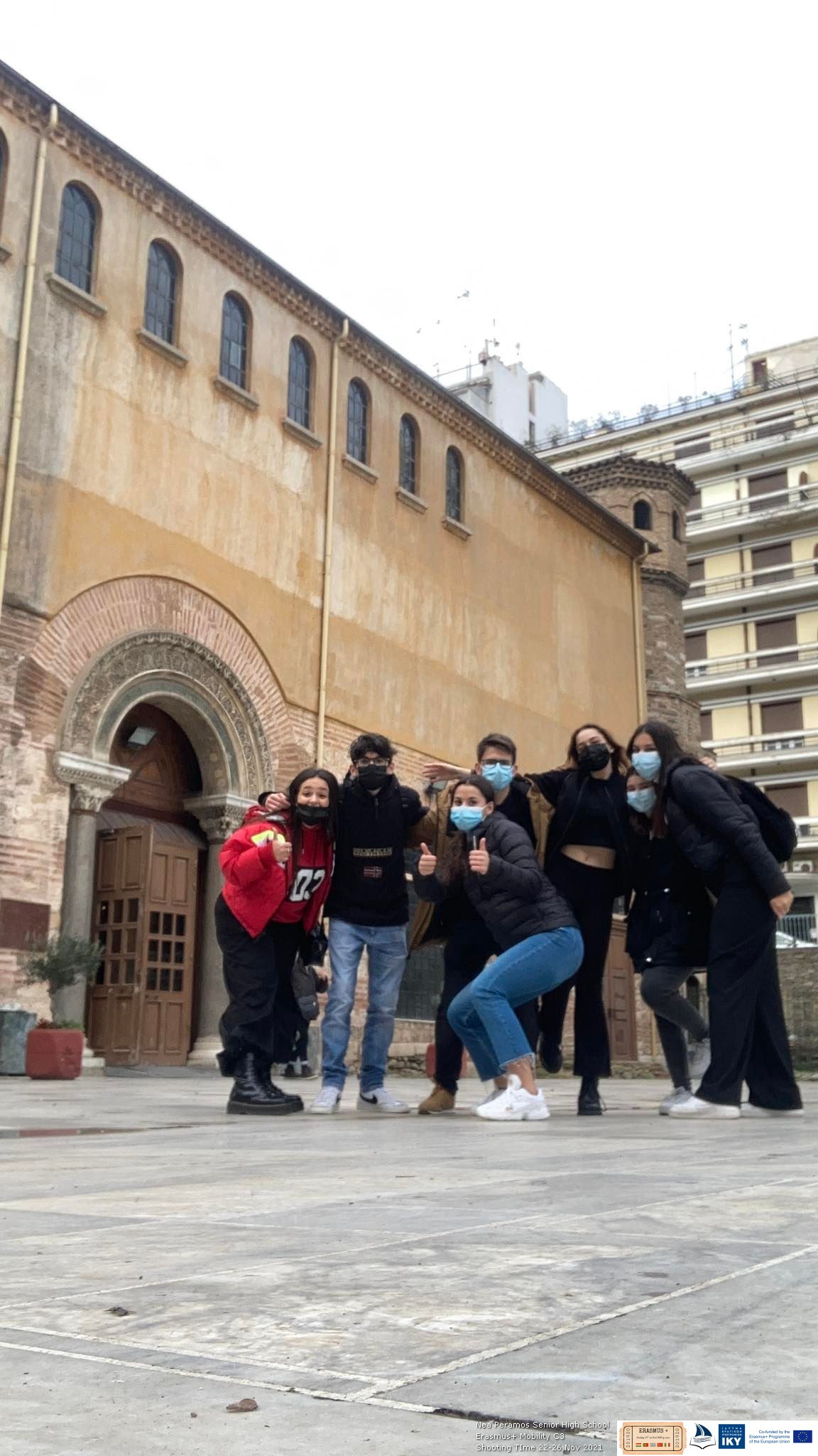 Η κινηματογράφηση όμως δεν σταμάτησε μόνο στον νομό μας. Πραγματοποιήσαμε επίσκεψη στο Μουσείο Κινηματογράφου της Θεσσαλονίκης, όπου και εκεί μπροστά από τη θάλασσα τραβήξαμε σκηνές. Πολύ σημαντική στιγμή της επίσκεψής μας ήταν η ξενάγηση στο Μουσείο, και ιδιαίτερα η χρήση του Greenroom, για την παραγωγή ολιγόλεπτων διασκεδαστικών βίντεο με τους μαθητές, που καταδεικνύει την δυνατότητα του κινηματογράφου να παρουσιάζει τον κόσμο με την δική του «αλήθεια». Η ξενάγηση στην πόλη συνεχίστηκε στις βυζαντινορωμαϊκές αρχαιότητες.